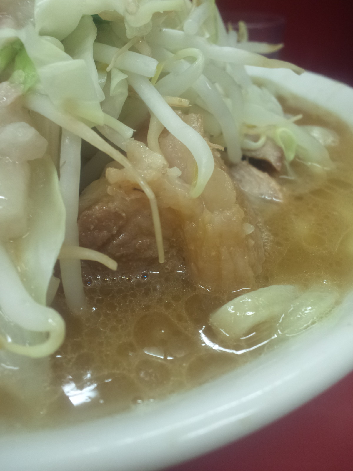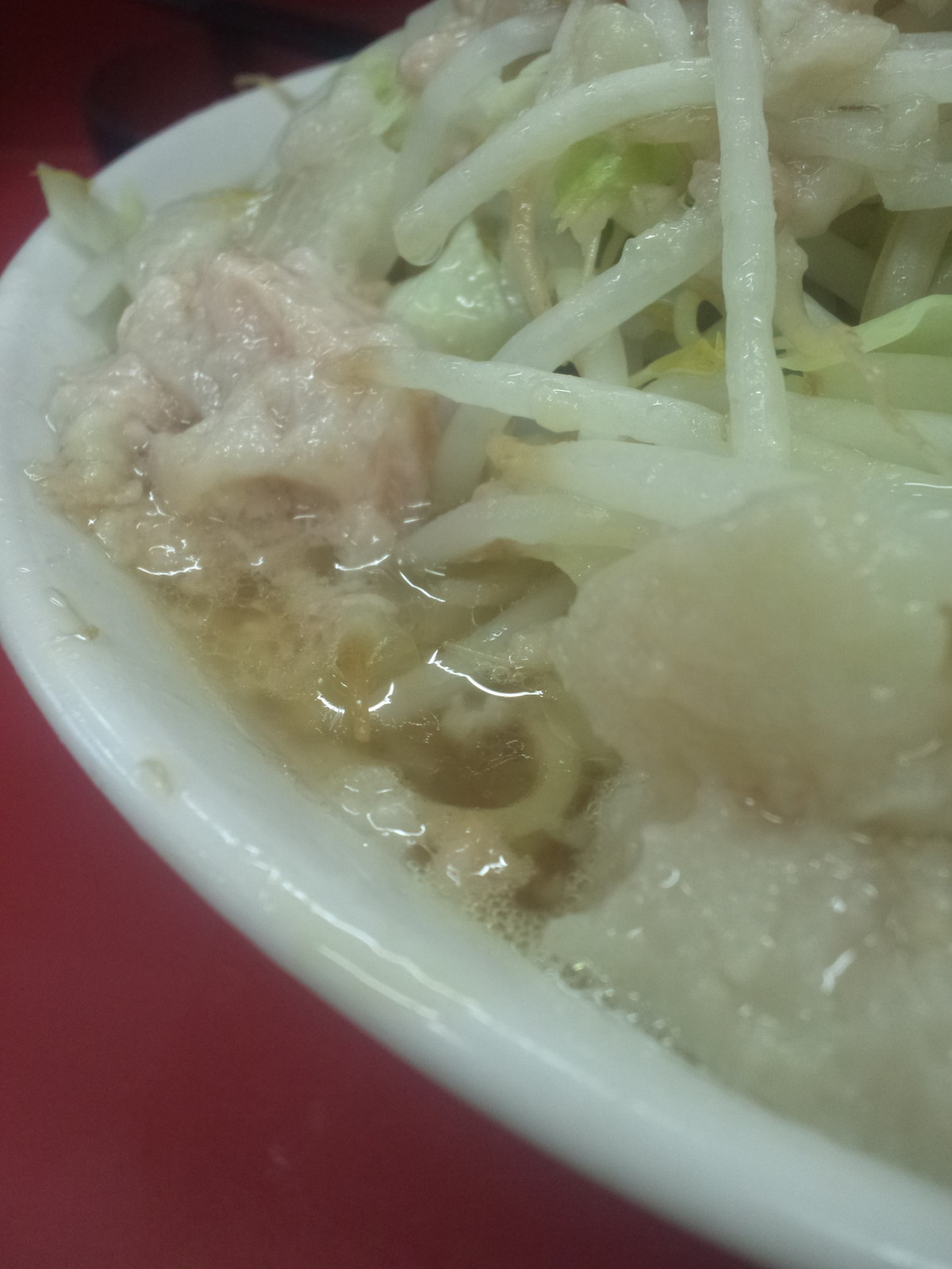 まずは上から、前菜的に野菜を頂いていきます。脂と野菜をまぜまぜ、野菜もちっと欲しかったなと思いながら食べると、軽くクタで食べやすくて脂も臭みがなくて、うま。
