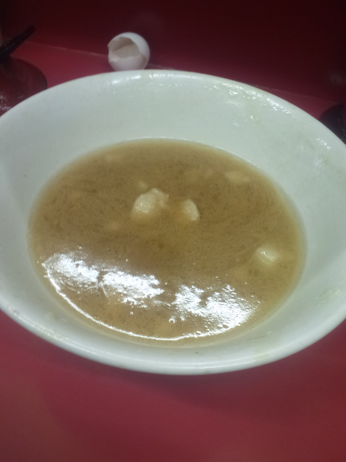 豚はザクザクとした食感で、柔らかい、とは言えないかもですが、脂身もあってパサはなく、うまー。とろりととろける食感もイイんですけど、このザクザク食感もイイんですよねぇ。豚ダブルがないのが本当に残念。で、完食です。