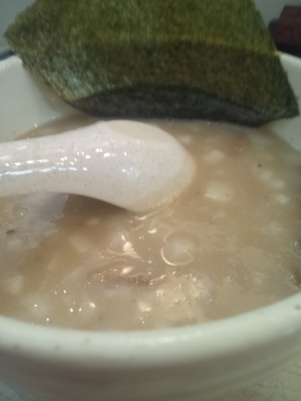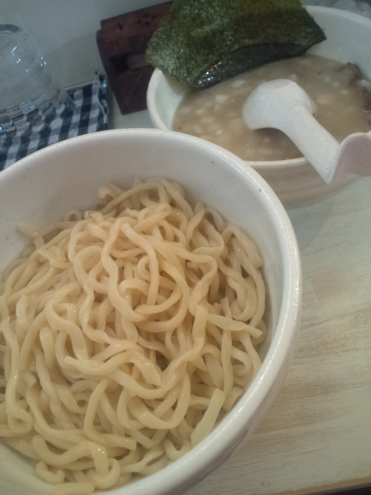 麺は表面がつるりとした縮れた太麺で、水道水での締められたらしき冷たさ。で、固めなもっちりなイメージ。透明感があって加水はきっと高そうです。つけスープはとろみがある白濁で、見た目にもかなり濃厚そう。で飲んでみるとかなり濃厚ながら、塩も立った様な味わいでショッパー。