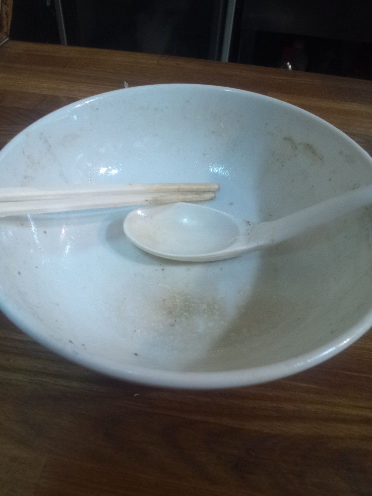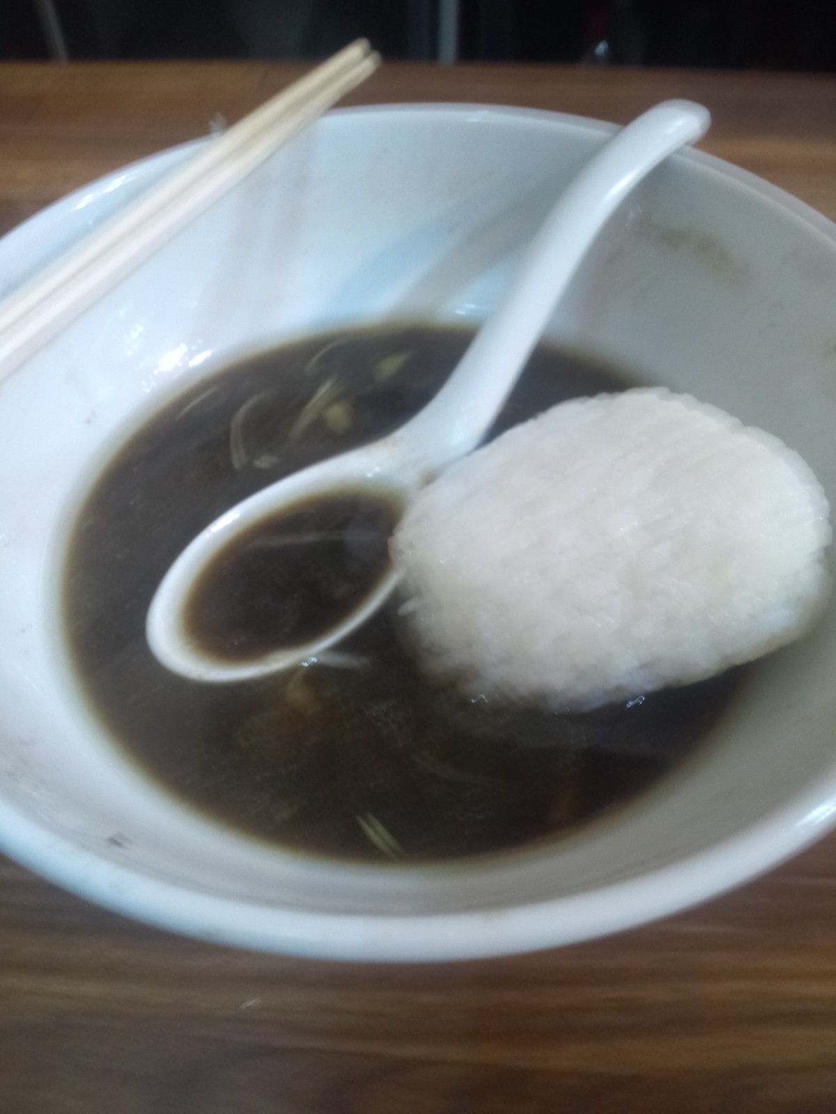 残ったスープでご飯持込の簡易雑炊。ご飯で食べると、麺で食べたときよりしっかり烏賊が味わえて、ちと不思議。油が少なくなったからでしょうか?しかし、ショッパー気味と分かっていたのに、しっかり完食してしまいました。また来よう。