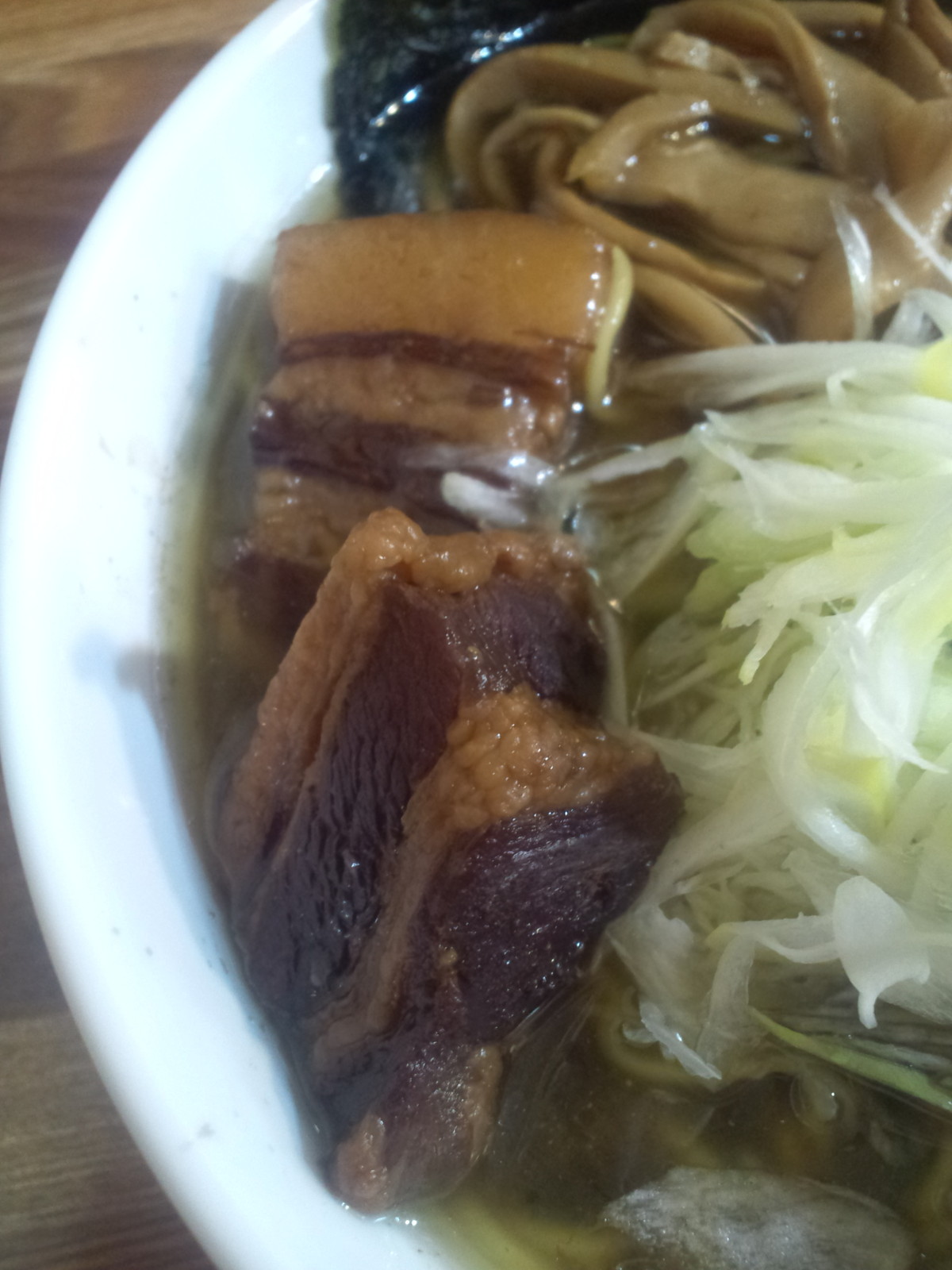 麺後半に残りの具材に。色が殆ど付いていない、バラチャーシュースライス。味わい的にスープよりもインパクトは弱め、脂身の甘さは感じるんですが。