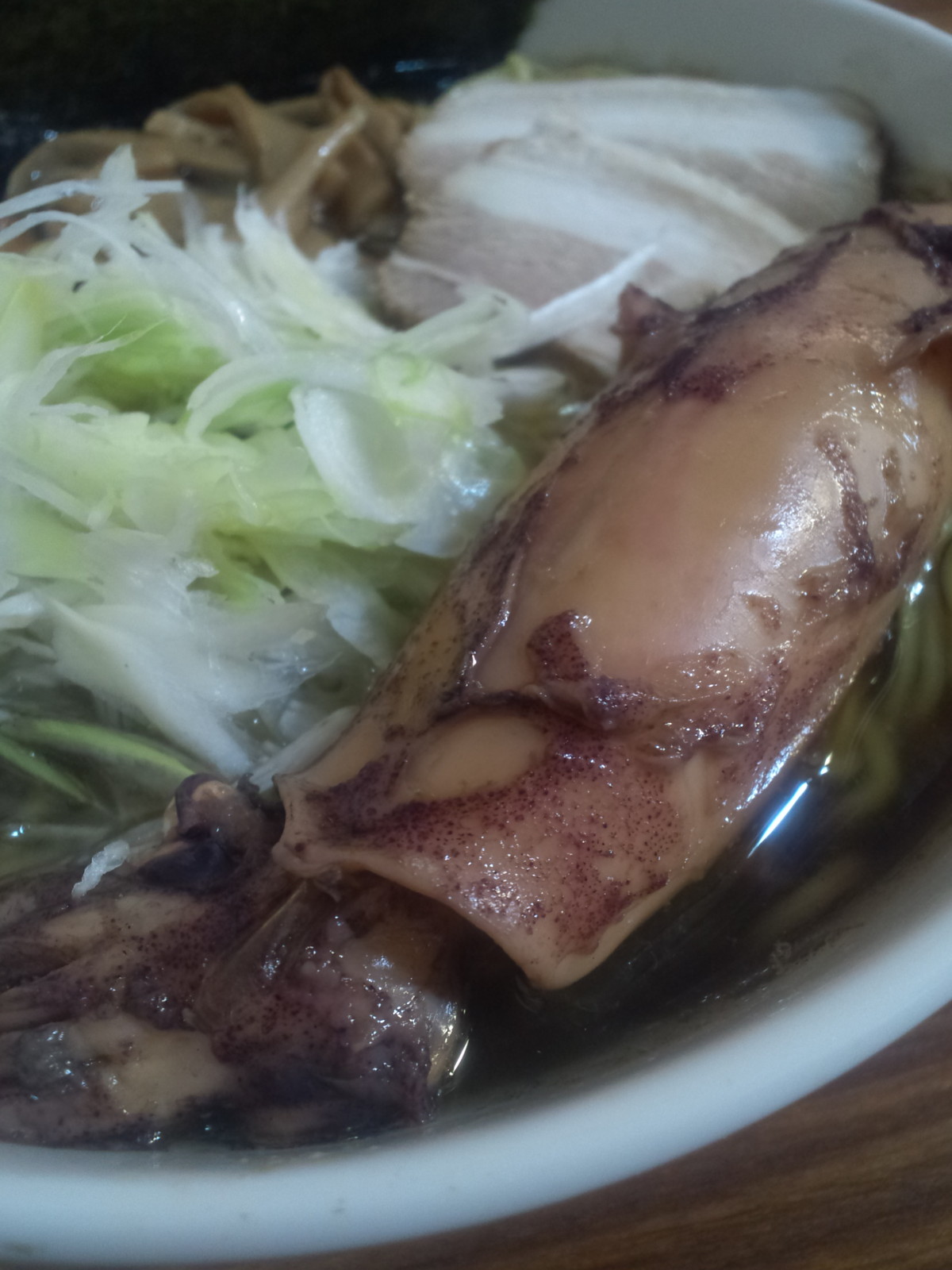 表面は結構な油の層・・・って、具材に丸ごとヤリ烏賊姿煮が一杯分。ですか。悪魔肉はいつものスライスではなく、角煮のような感じ、ですが、悪魔肉のようです。