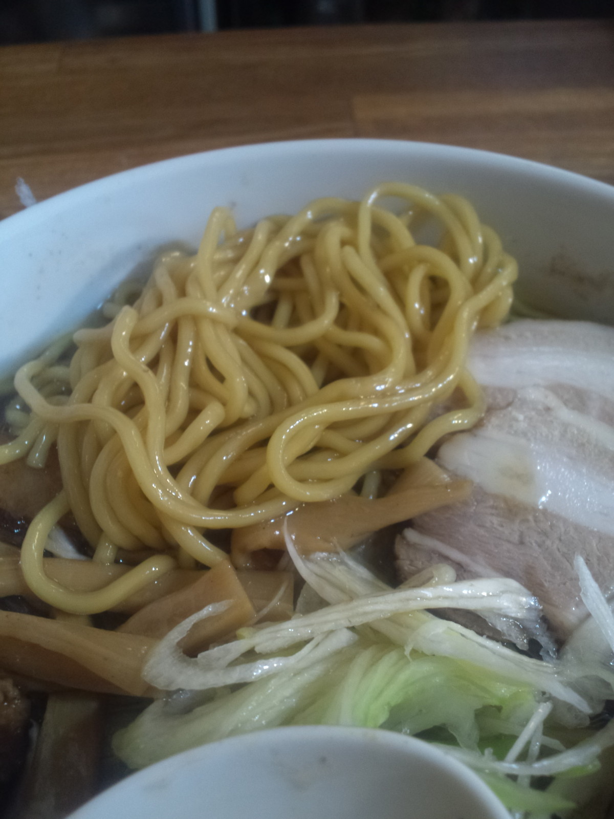 麺はいつもの、中太ほぼストレート。しっかりスープ持ち上げ、でもない油多めにも感じますが、元のスープが濃いめだからか、結構味わいはしっかりで、うま。油もイイ感じで気持ち大味気味、でもしつこくない感じかと。しかし今回はネギの仕事がすばらしい。ネギの仕事を感じる、ということは、どこかでスープにしつこさや重さを感じすぎてるってことですかね?
