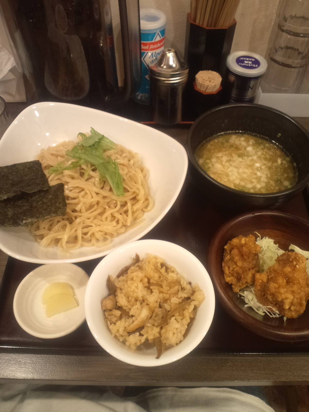 何かスゴイセットが、お盆に乗って来ちゃったなぁ!・・・って、でも1000円オーバーだしね、が第一印象。見た目に濃厚そうなつけスープ。レンゲ・・・がないな、と箸を入れてかき混ぜてみると、でんぷんチックなとろみは感じられません。