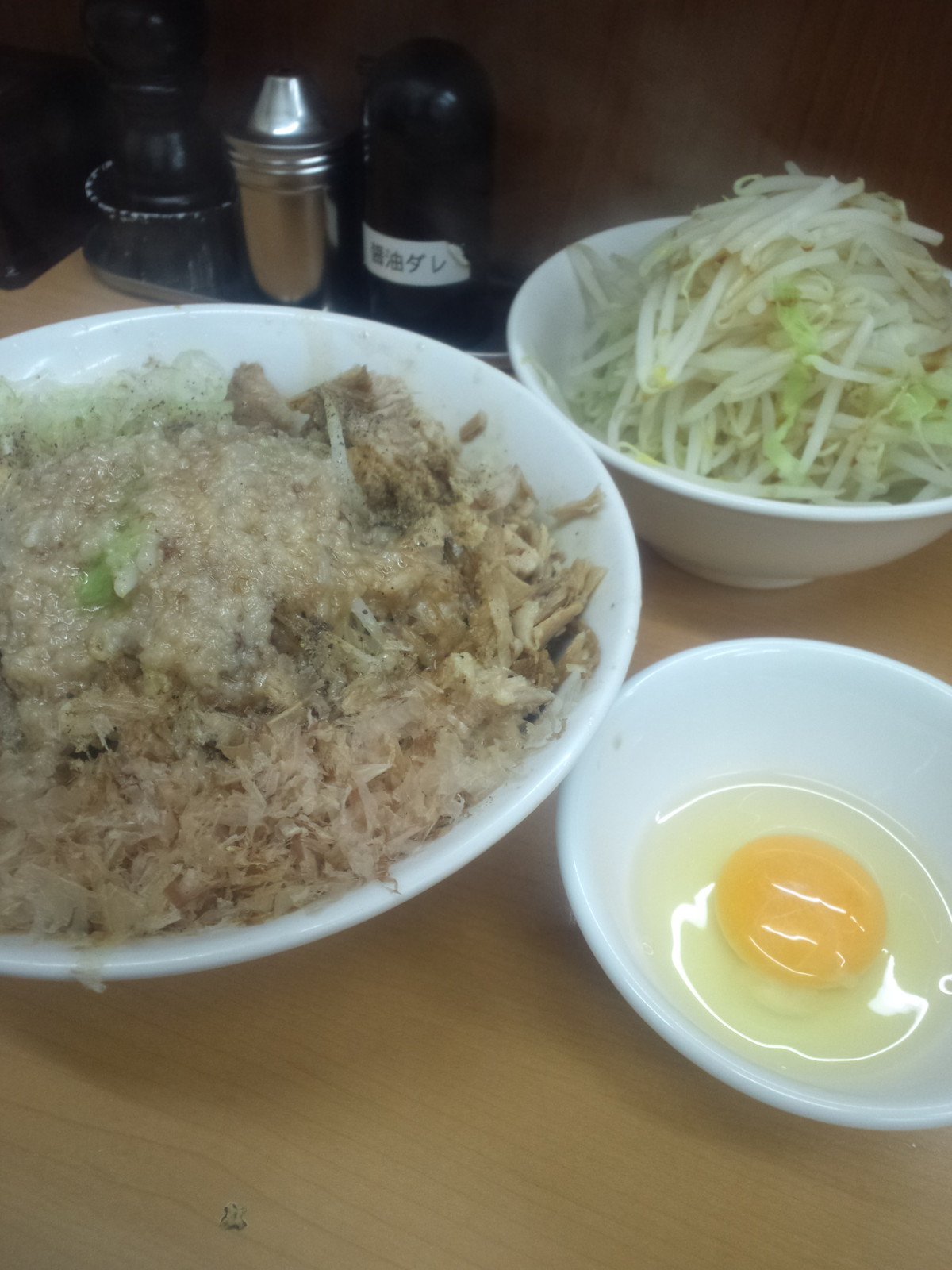 の前に、別器で野菜増し分の野菜と生卵が渡されています。口頭で注意事項。まずはそのまま食べて、途中から使ってください、とのこと。とボトル2つ。酢とごま油ですかね?