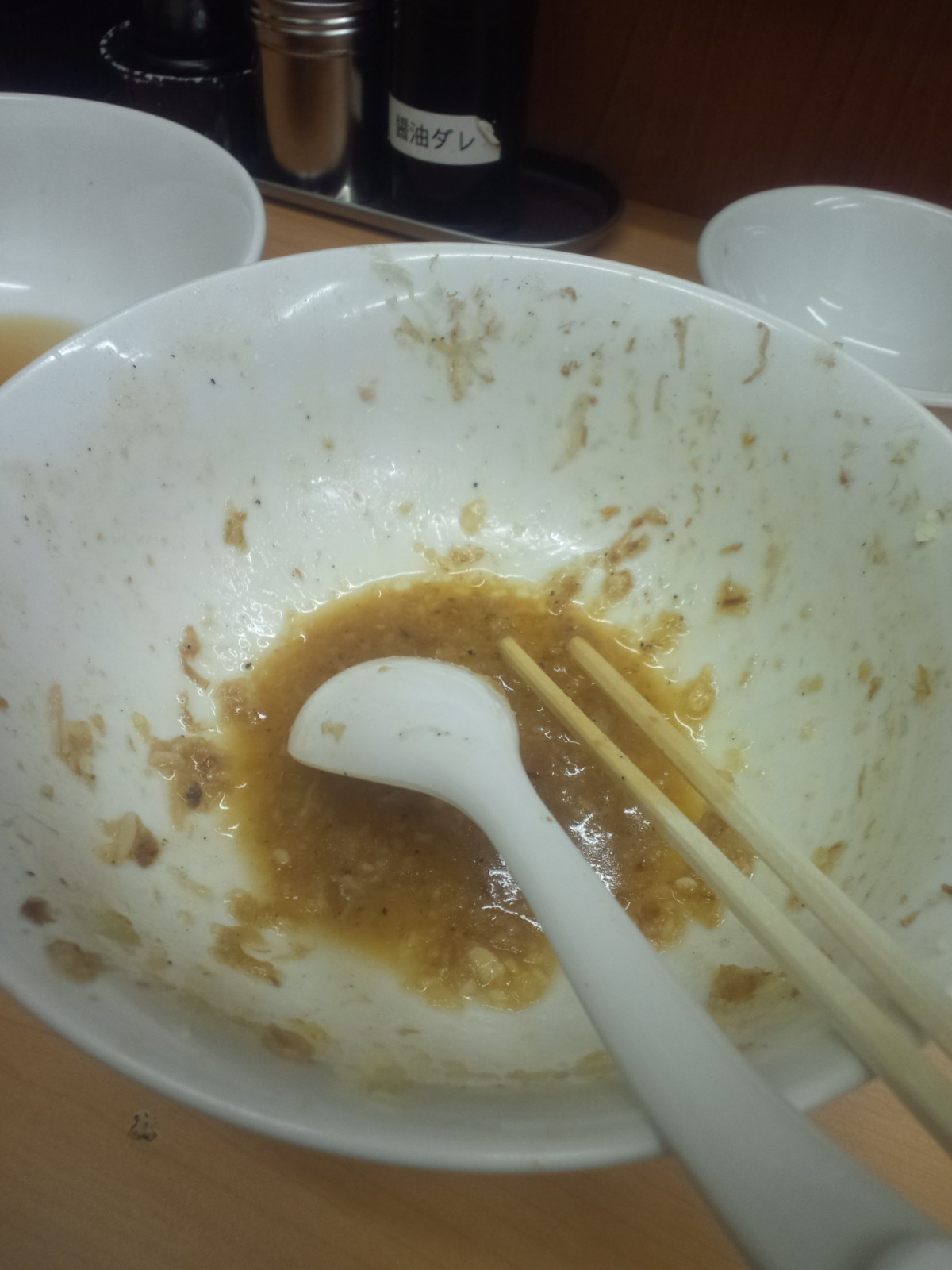 後半には生卵投入で混ぜ混ぜ、味変的になりつつ安定のもうまさですね。 この濃厚さなら黄身だけでも良かったかな、と思ったところは最終盤。