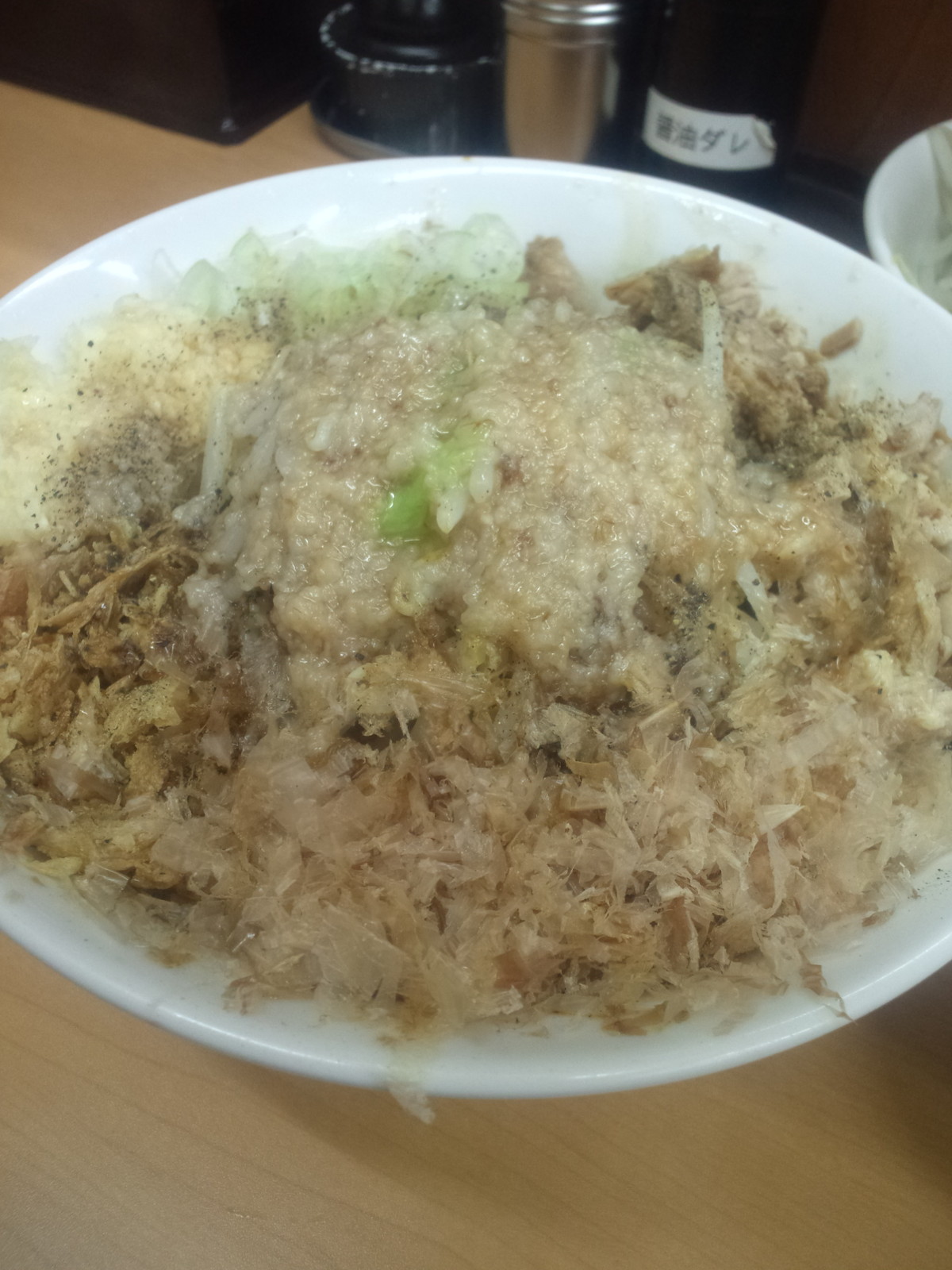 混ざってしまった鰹節も噛んでいると 鰹の香り。その仕事が伺えます。最初はにんにくを混ぜず、刻みネギとちとチャーシューを混ぜ混ぜして麺をすすっていきます。