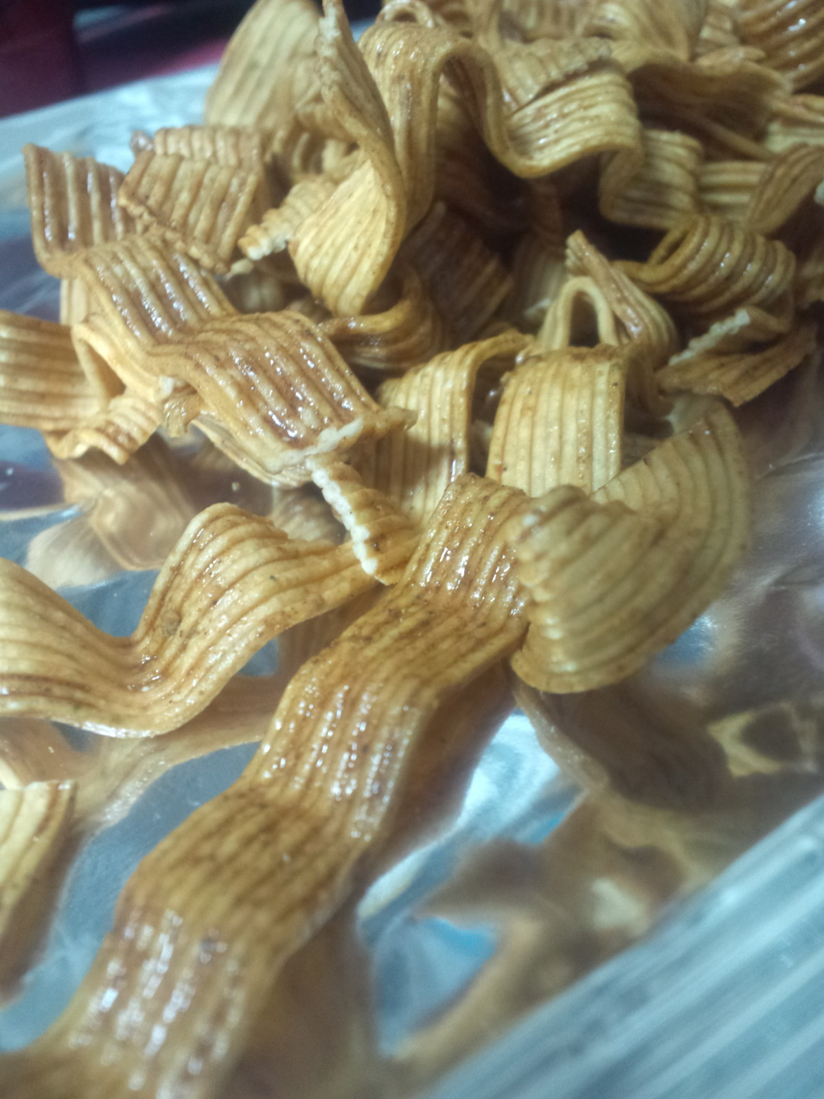 パウダー系ではなくて、ソース系がかけられたようなタイプで仕上がた感じです?が、第一印象。どっぷり漬けられた感じ、ではないですが。早速頂いてみると、ブルドックとは分からないですが、ソースのあんばいと独特の感じがもんじゃ焼きを感じさせるものがあるかも。