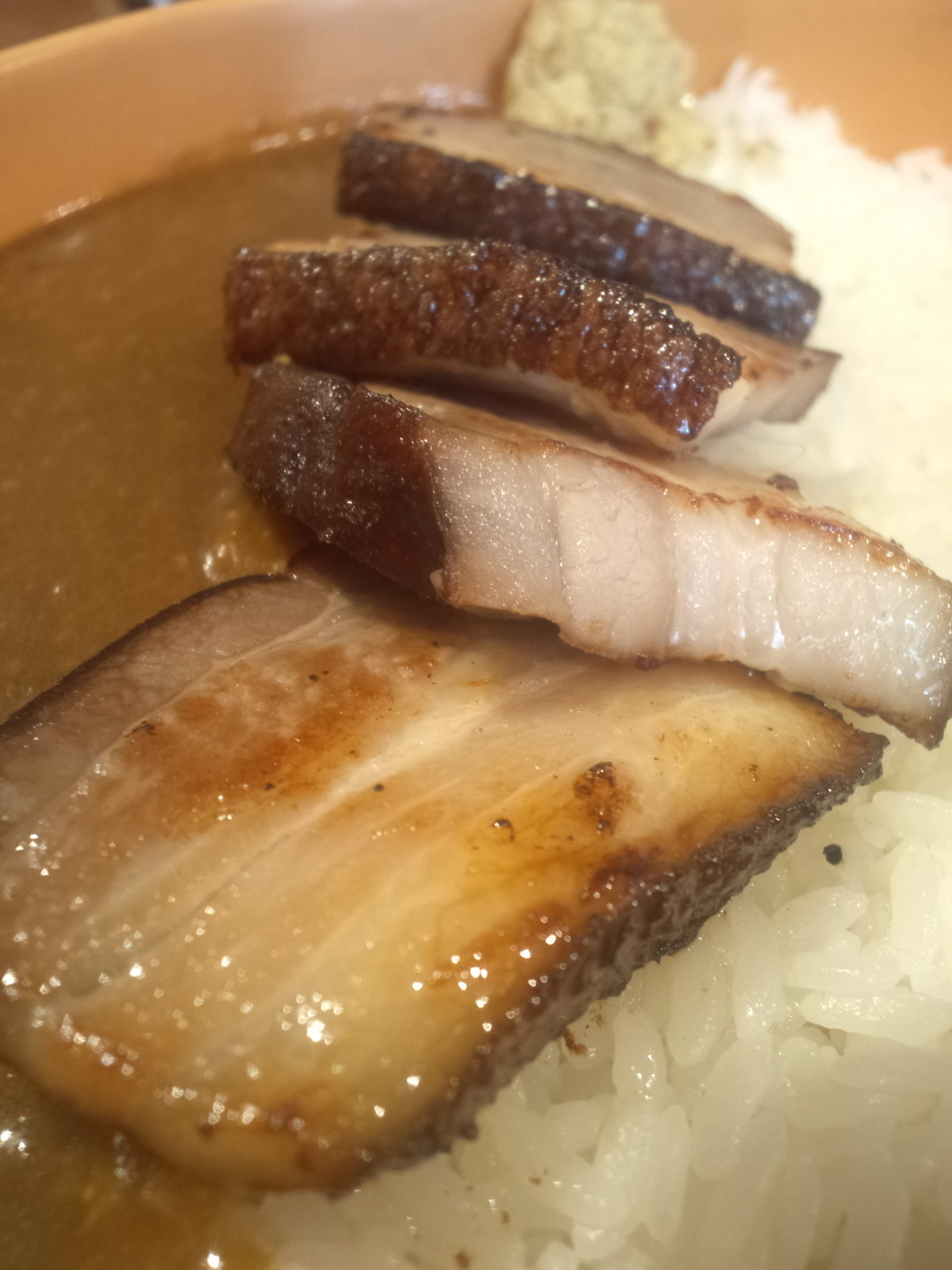 際立って燻製感があるわけではなく、スパイス感が突出しているわけでもなく、適度に甘さもあってコクしっかり、このバランスがとても好みです。大盛りにしなかったことを後悔し始めます。