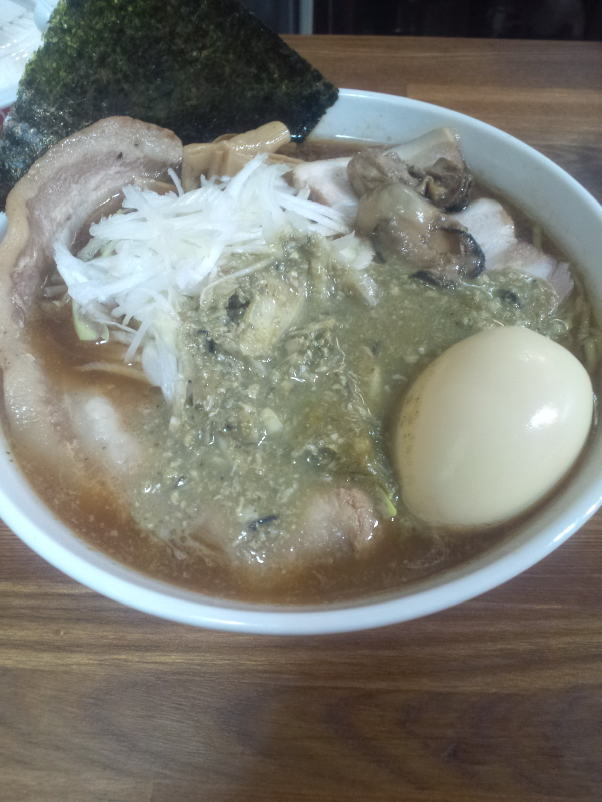 牡蠣醤油付けの様なトッピングは、ショッパー味わいの中に牡蠣の濃厚な味わい。2種のチャーシューとこの牡蠣、存在感しっかりで、圧倒的にお酒が頂きたくなります。