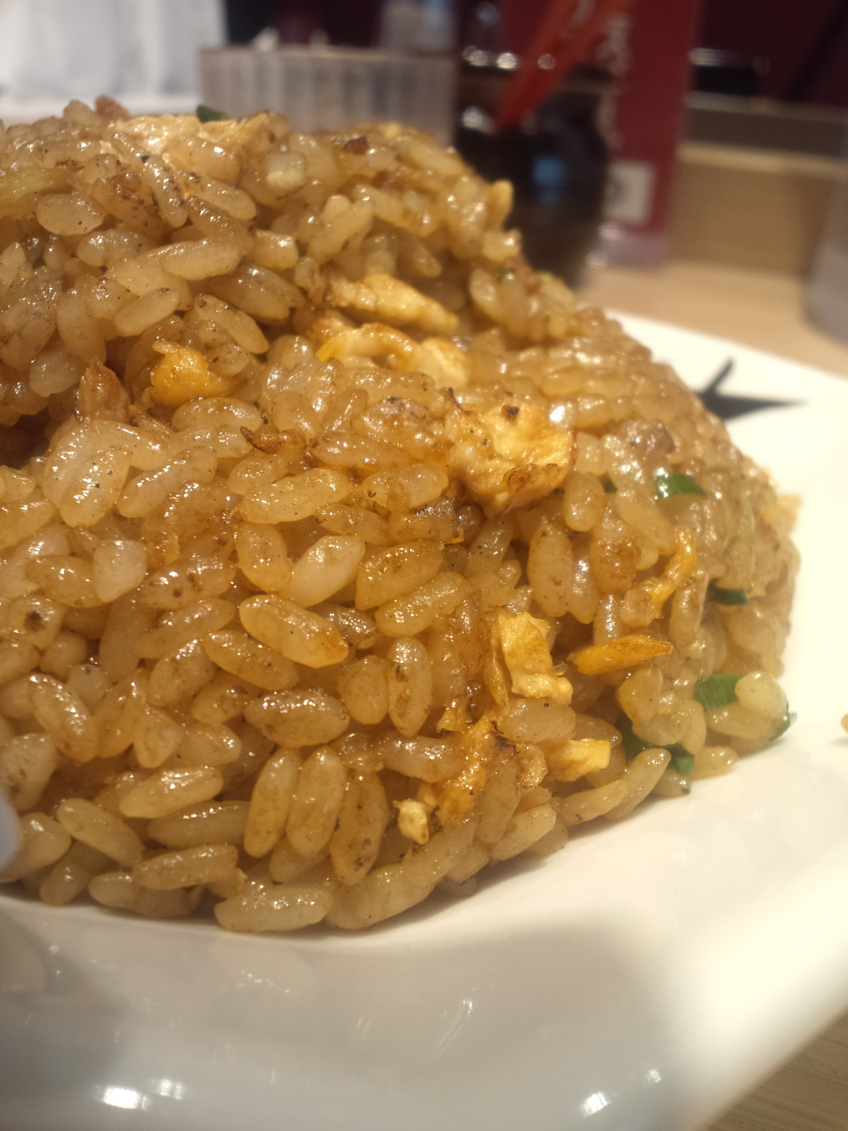 麺の中盤からラーメンをスープ的に炒飯を。炒飯は単体では物足りない?ように感じたひと口目でしたが、ラーメンと合わせるとイイ感じかも、このコンビを考えた味付けなのか。炒飯を食べるレンゲと、スープを飲むレンゲが中々止まりませんよ。黒炒飯でコレなら、白炒飯はどうなるんだろう。興味だ・・・中かな。