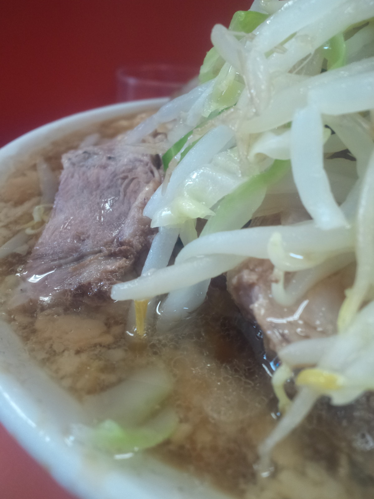 野菜の下には豚一面ですが、ちと避けて先に麺を。一時期はメンカタ厨であったが私ですが、二郎で初めて、麺柔らかめでお願いする、人間って変わるなぁ(年を取っただけともいう)。