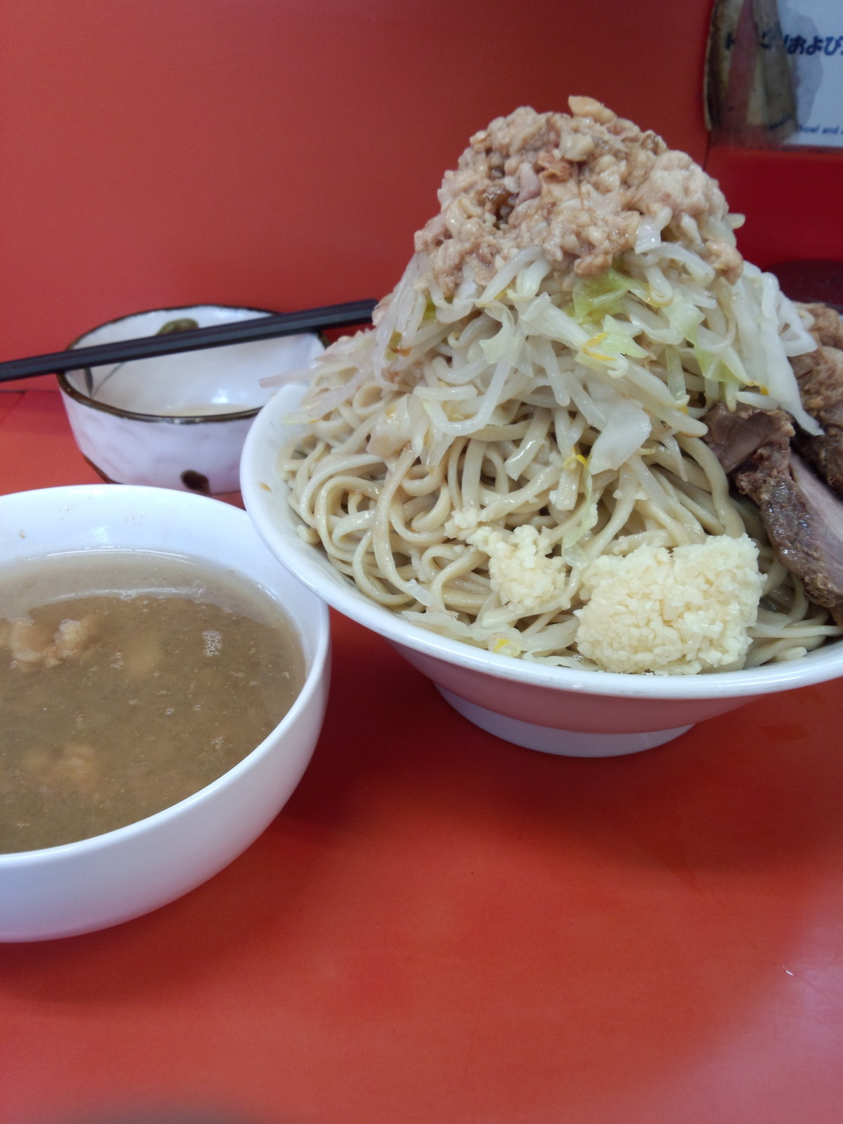 開店時間と同時に開店。今回は調子に乗って「大」で。豚増しで。生卵付けて。1000円、きっと日頃のストレスを吹っ飛ばせるに違いない、と待っていると、「ニンニク入れますか?」とのことですので、