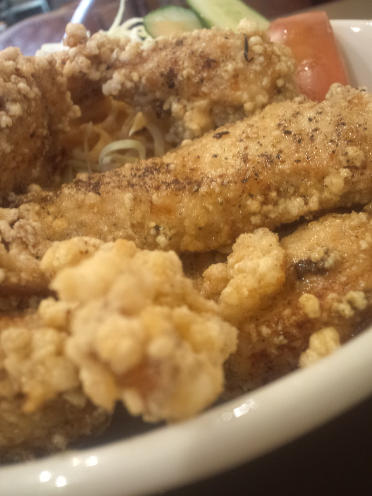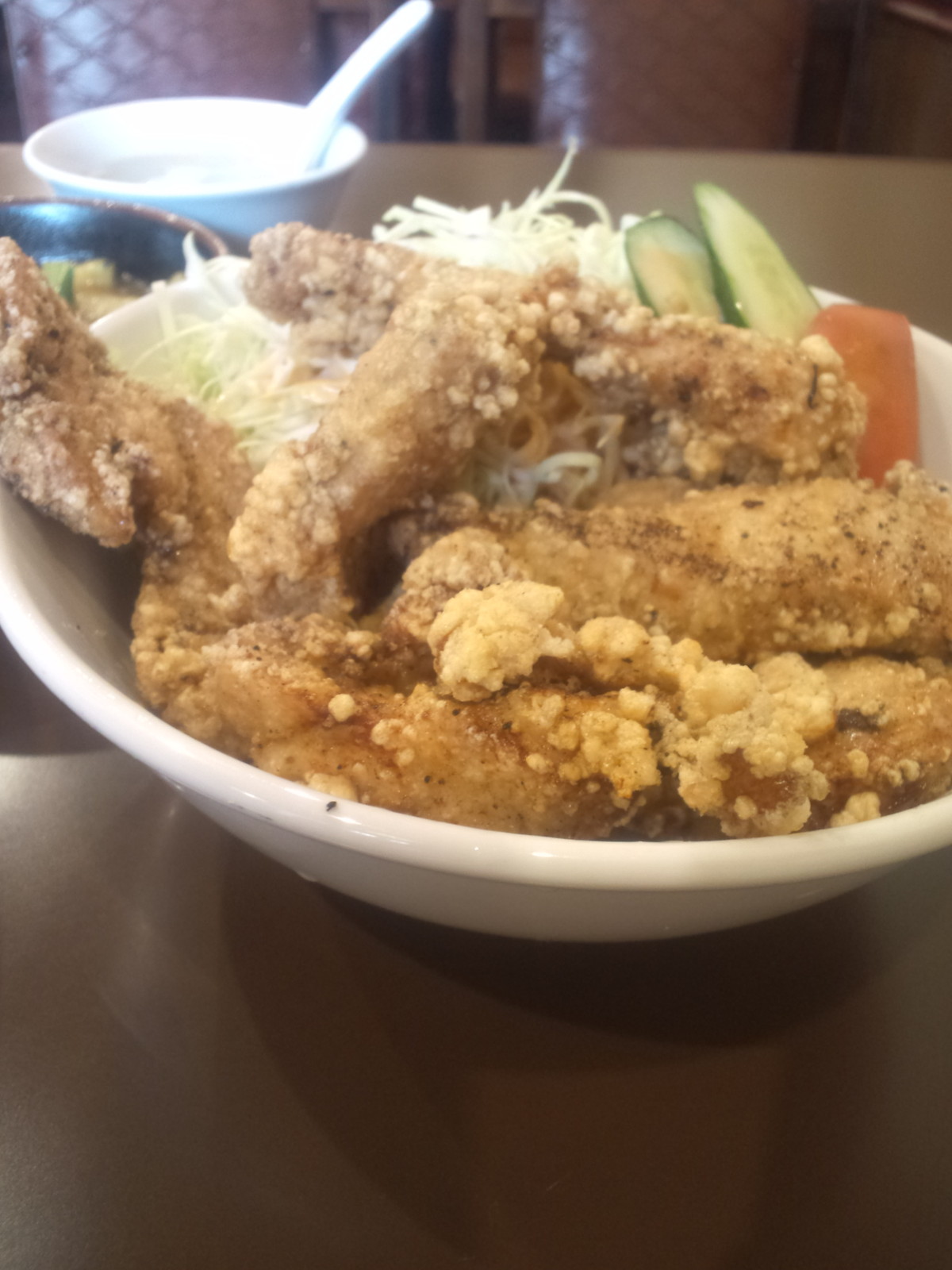 唐揚げは胸肉の細切りチックなもの。ちと前に神保町の某店で食べた、チキンフライよりは太くてしっかりです。サクみは少なめですが、ほぼ揚げたてのため、パサはないですね。