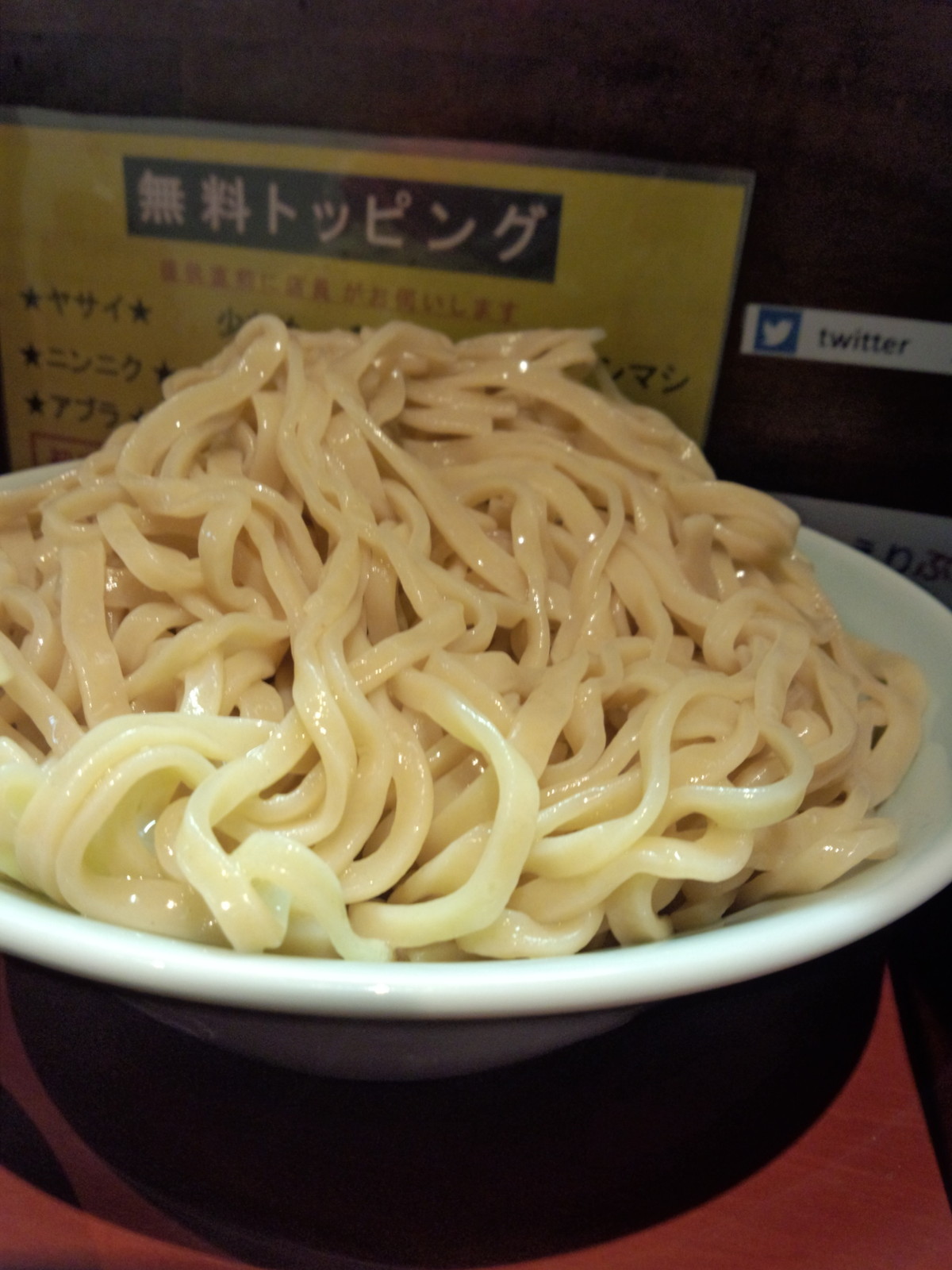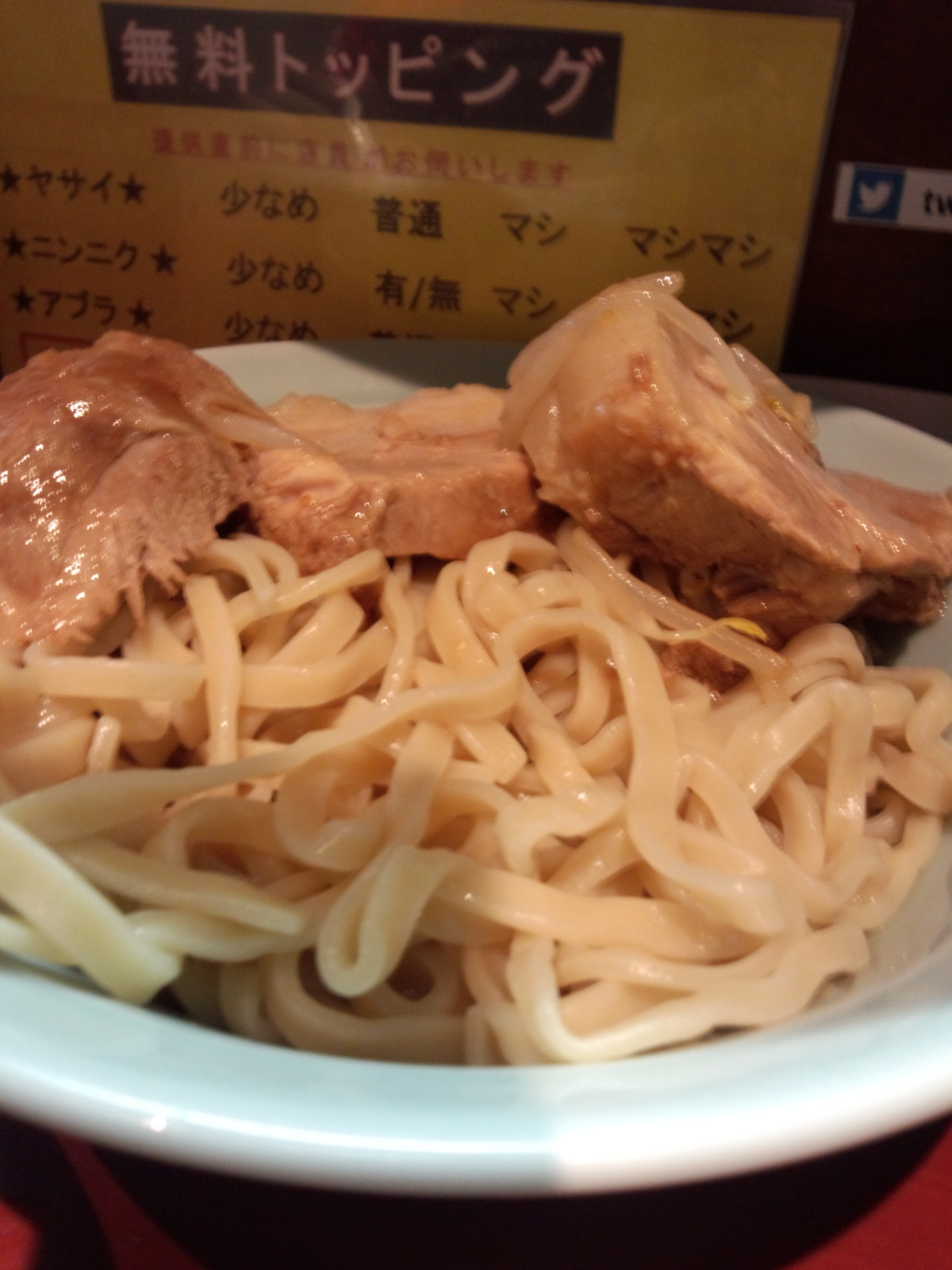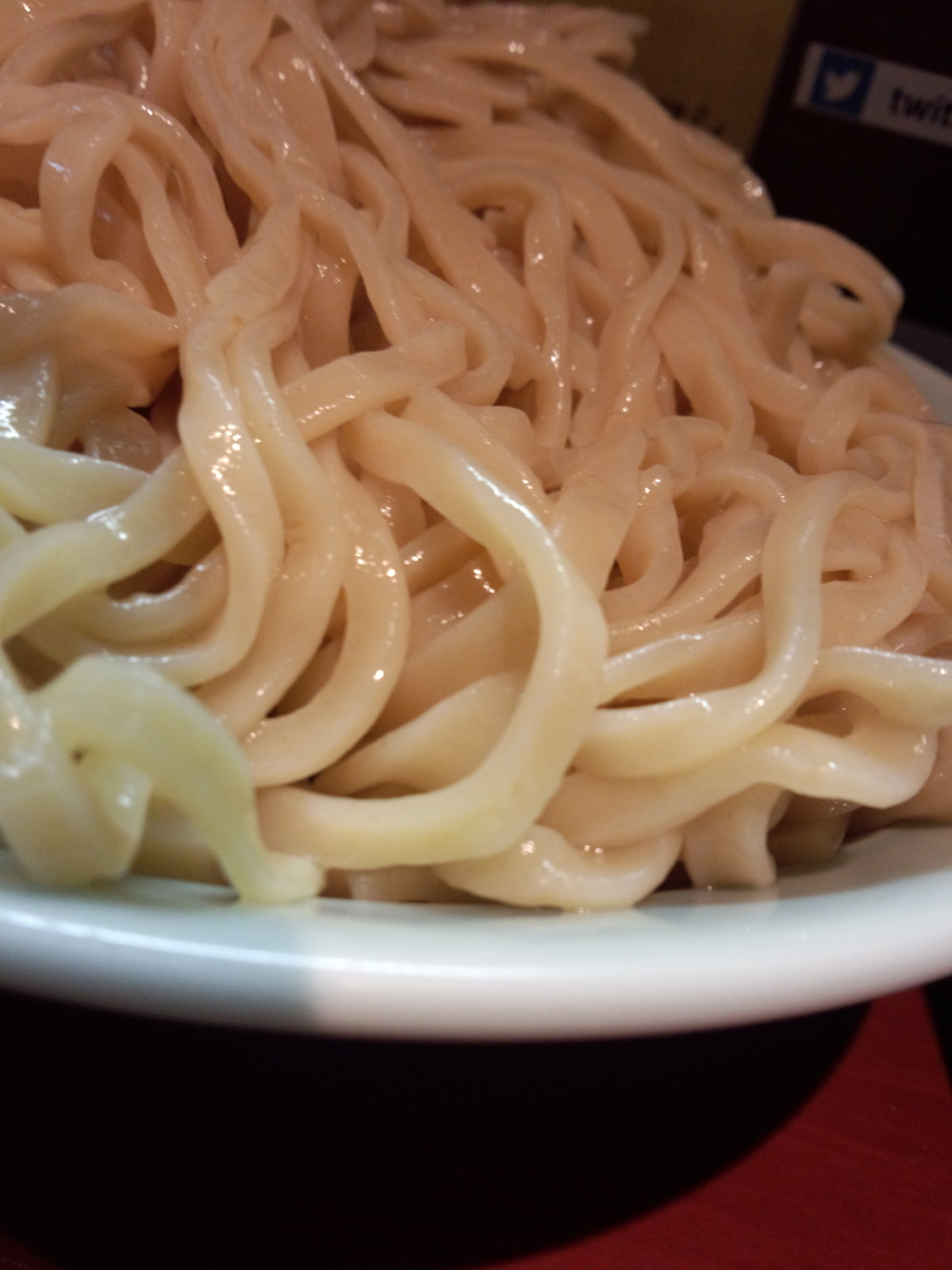 スープは気持ち乳化していて、しっかり動物系の濃厚なもの。脂はそこまで多くないので、(二郎系にしては)重い印象はありません。