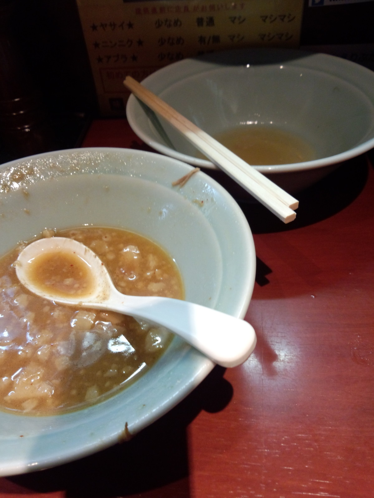 麺をつけつけするスペースを作るための野菜をちと食べるつもりでしたが、思いの外、スープを吸った野菜が好みで、気がついたらいつも通り殆ど野菜を食べてしまいました。