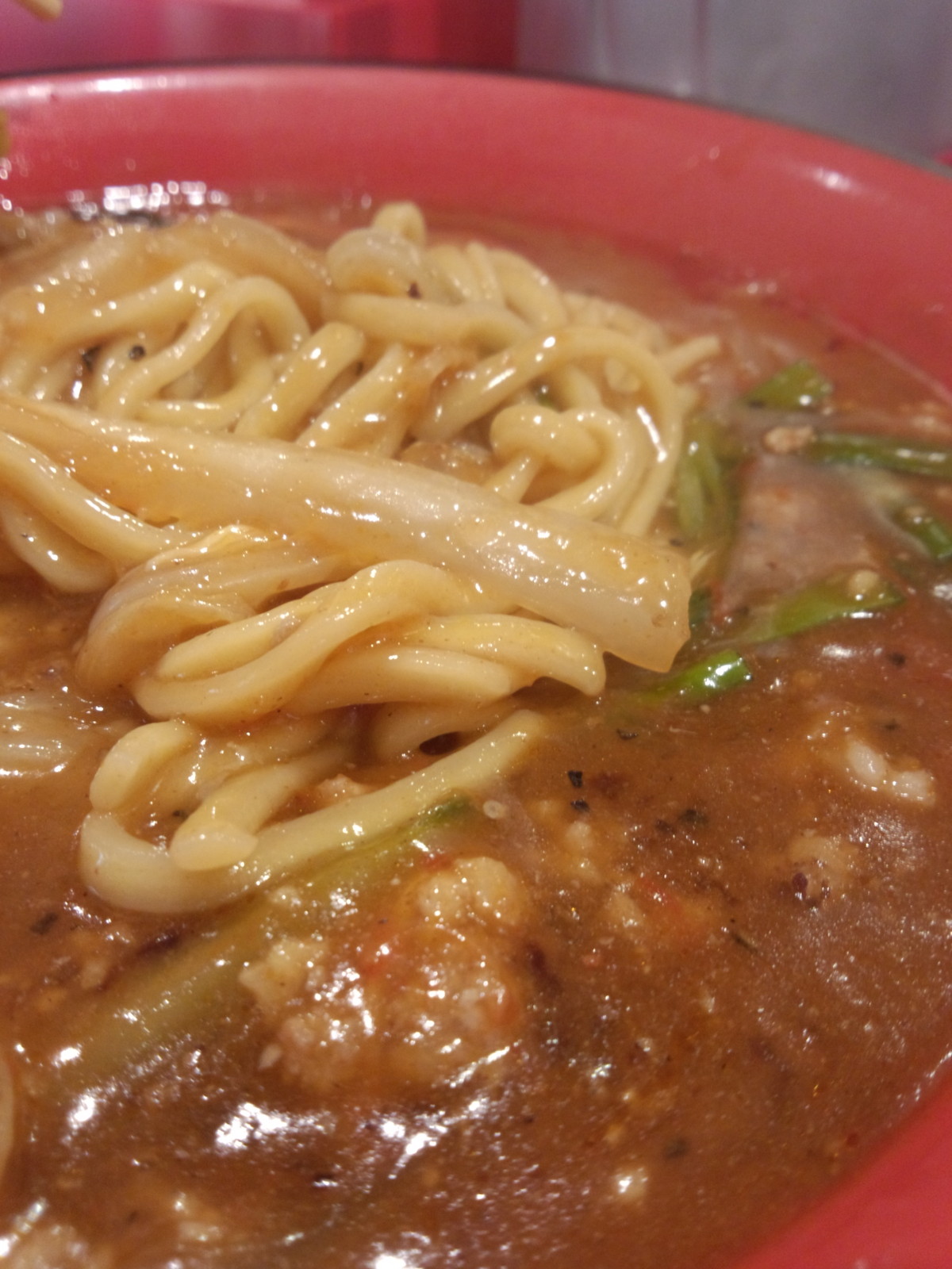 麺は中太〜太麺の縮れチックでもっちり、気持ち柔らかめでしっかりスープが絡みます。スープと卵の組み合わせの風味に、ニュータンタンを思い出しなが