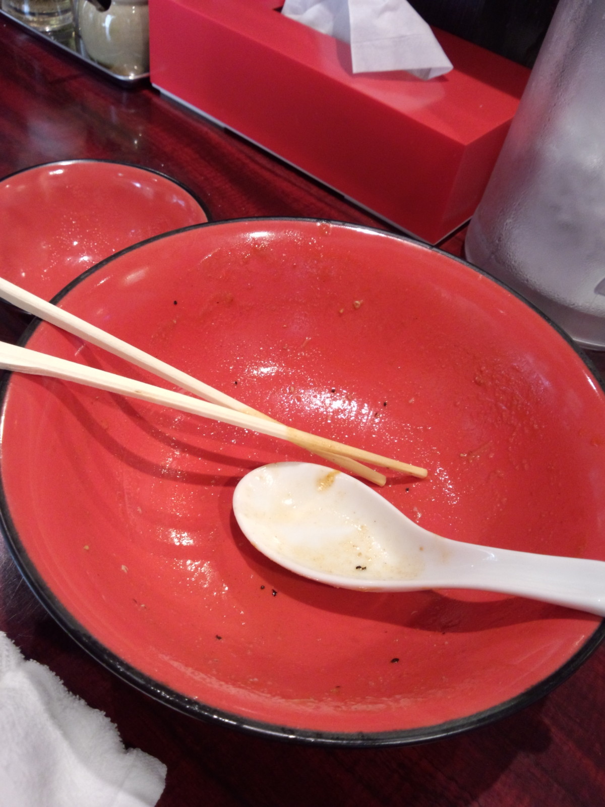 ここまでガマンし、何とか手をつけないでおいたご飯を、そのまま残ったスープにイン!で簡易おじやにし、さらさらっといきたいところでしたが、熱さをしっかり冷ましながらゆっくり頂いての完食です。この新灼熱、生卵のトッピングあったら・・・と券売機を見ましたが、券売機にはボタンはなしでした。