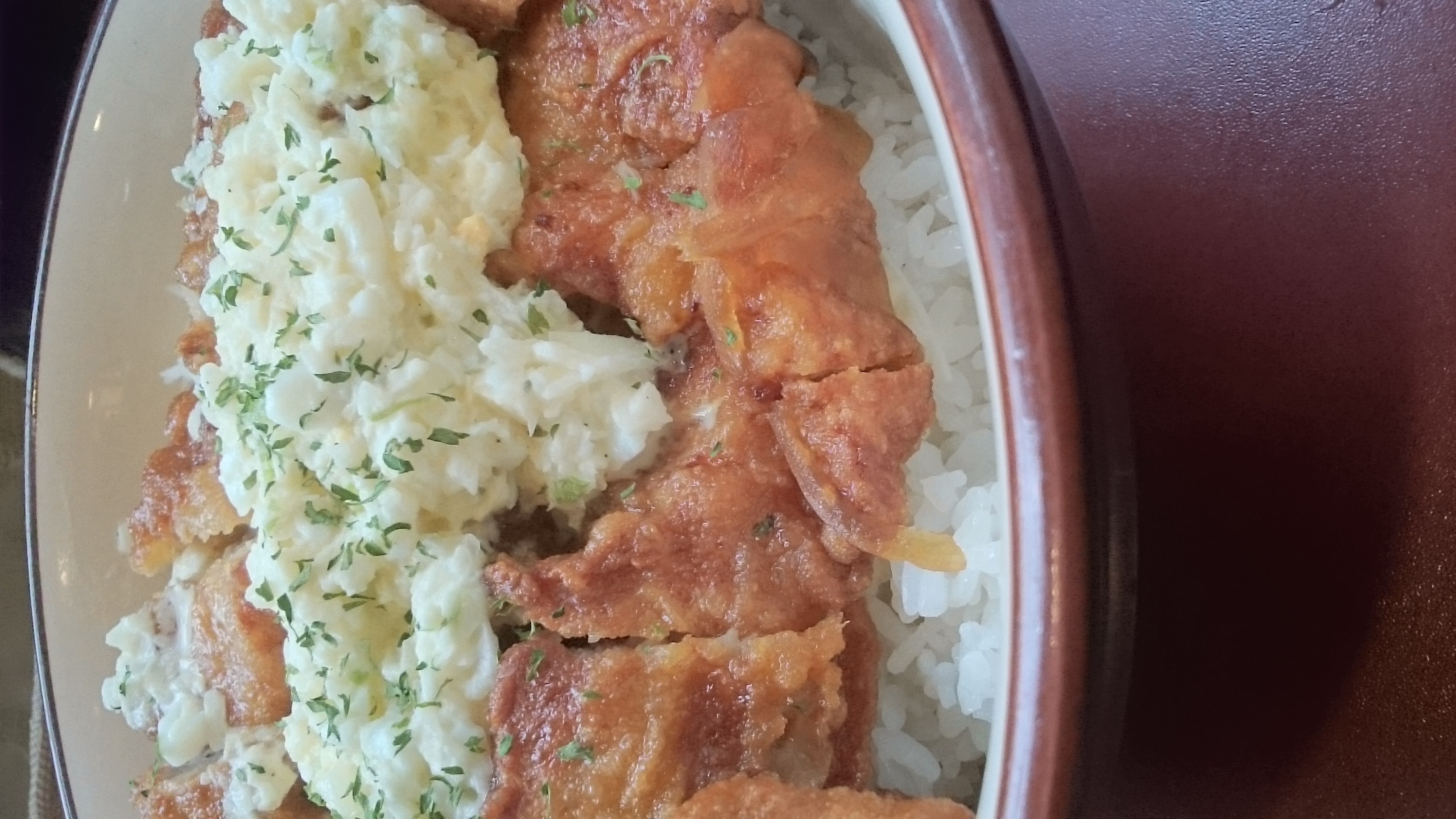 唐揚げ丼は、器よりも上部に、立体的に盛られたモノに対して、チキン南蛮丼は立体的度はかなり低め。しかし自家製らしい多めのタルタルソースが、何とも食欲をそそるなぁが第一印象。まずは上から、とタルタルソースだけ箸で頂いてみると、・・・ん!?想像していたのよりもかなりマヨ率が低い、というか刻み生玉ねぎ?が多めで、悪く言うとかなり水っぽい仕上がりに思えます。