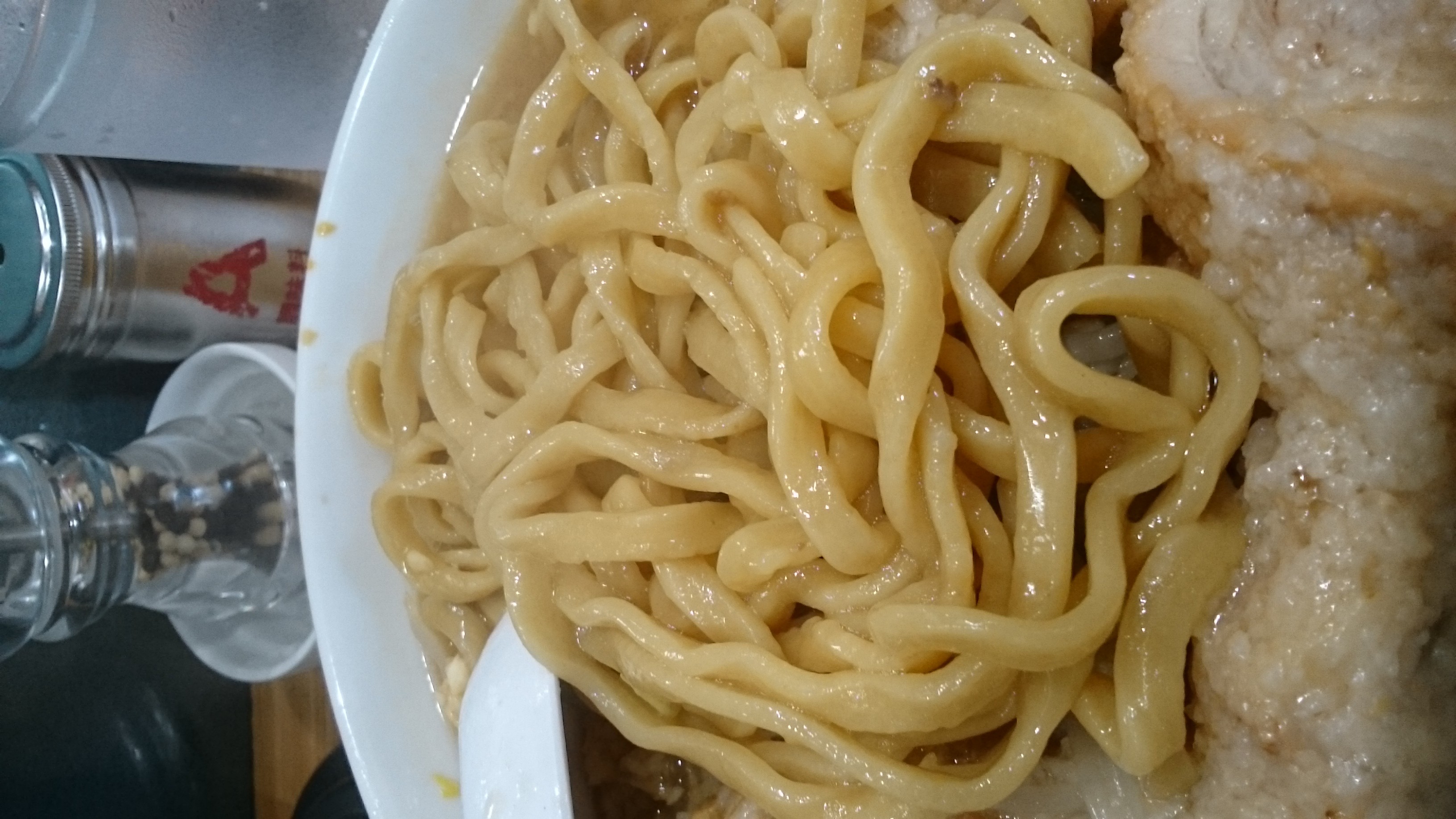 野菜をほぼ食べ終えて麺へ。麺は太〜極太の麺で、縮れ気味なちと平打ち的な感じ。固めもっちりのようなコシがある感じで、スープの持ち上げも良さげです。ただ個人的な好みでは、もちっと麺の存在感が欲しい感じ。