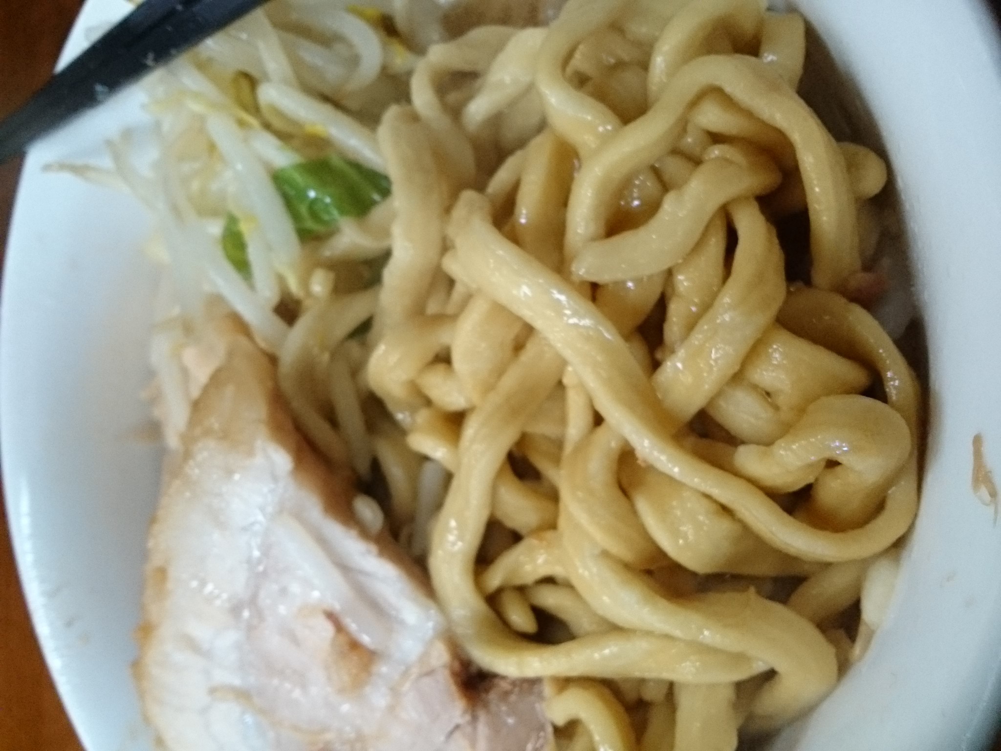 麺は極太で縮れのちと平打ち。何人かは麺固めでお願いしていたようですが、これより固かったら粉っぽく感じるんじゃ?と思うほど、啜る麺は固めでボキボキ加減。