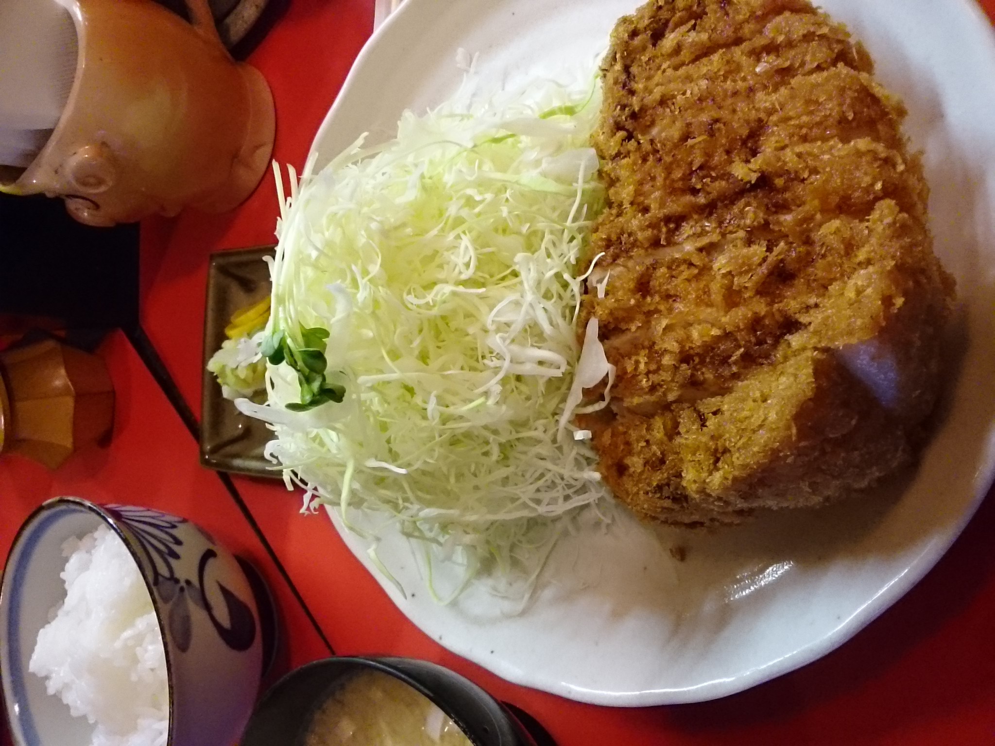 ご飯とお味噌汁ととんかつの三点セットが目の前に。「写真、撮ってもイイですか?」と聞くと、「イイけど、撮るならもう1分、後の方がいいかも」と助言を頂きました。