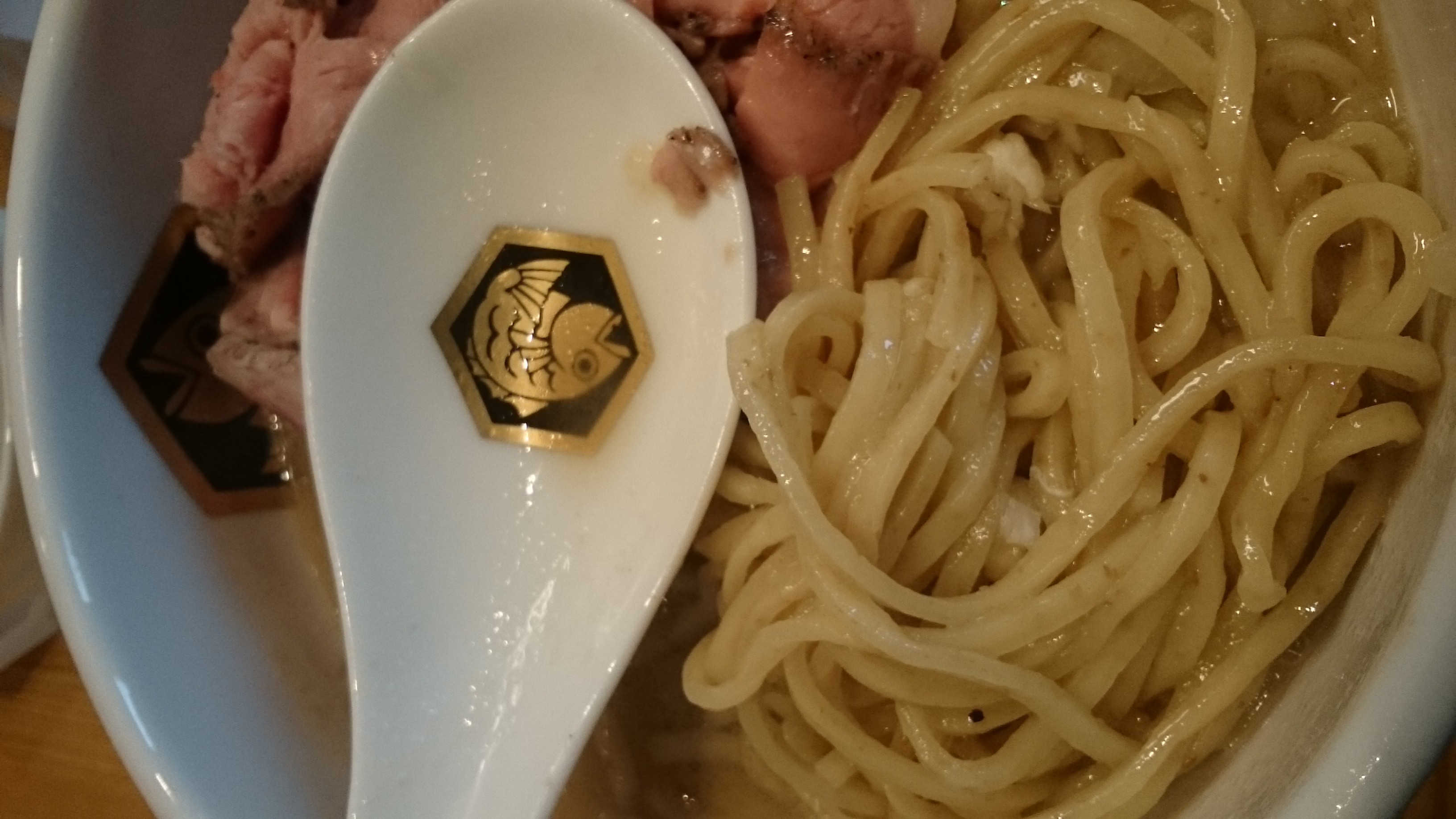 まずはチャーシューを避けてレンゲで・・・おっと、レンゲに鯛印がワンポイント。