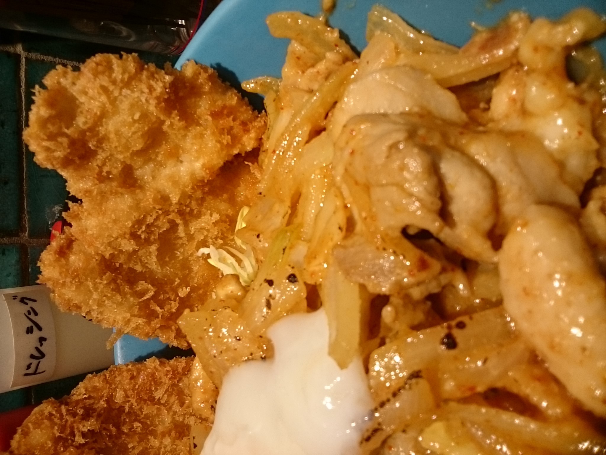 ご飯の上には、味噌で炒められた玉ねぎと鶏肉、薄いですがチキンカツが乗っているものです。確かにボリュームはありますが、1000円クラスなら、CP十分とは言えないかも?