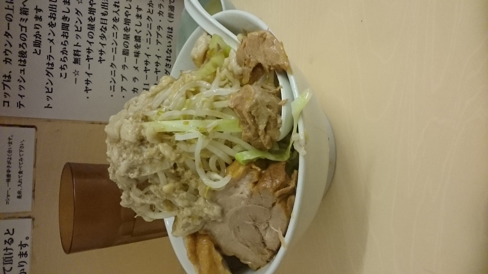 しかし助手の方も一言も話さずに、黙々と仕事をこなされながらも、連携とれてるな・・・と思っていると、ラーメン到着♪今回の全増しで、野菜を盛られた量は1.5トング。300g弱といった感じでしょうか。その盛られた野菜の上に、脂がしっかり乗っています。