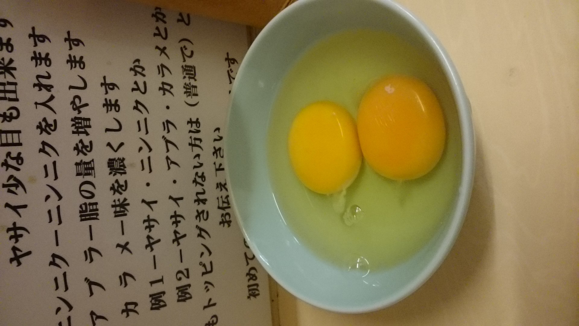 3分の1ほど食べたところに生玉子を投入。生玉子は2個来たのですが、デフォが1個だったんですね、知りませんでした。 溶き卵を麺に和え和えして食べると、分かり易く変わって、うま。しかし、生玉子を加えるとショッパーさが欲しくなったので、卓上のカエシをちと加えて調整。初めての喫食なのになぜか「コレコレ♪」と思いながらの完食でした。