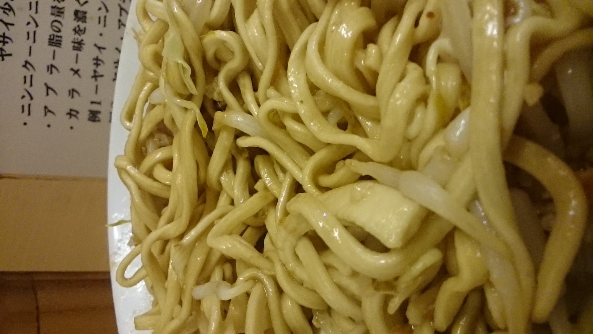 野菜を食べ終わって麺へ。麺はちと平打ちの太麺で、気持ち縮れたもの。汁なしなので、箸で良く混ぜ混ぜしているときに感じますが、箸から伝わる食感、麺が固い。ごわごわ。ボキボキ。混ぜ混ぜしてすすってみると、 アルデンテに到達しない固さ。でもうまー。