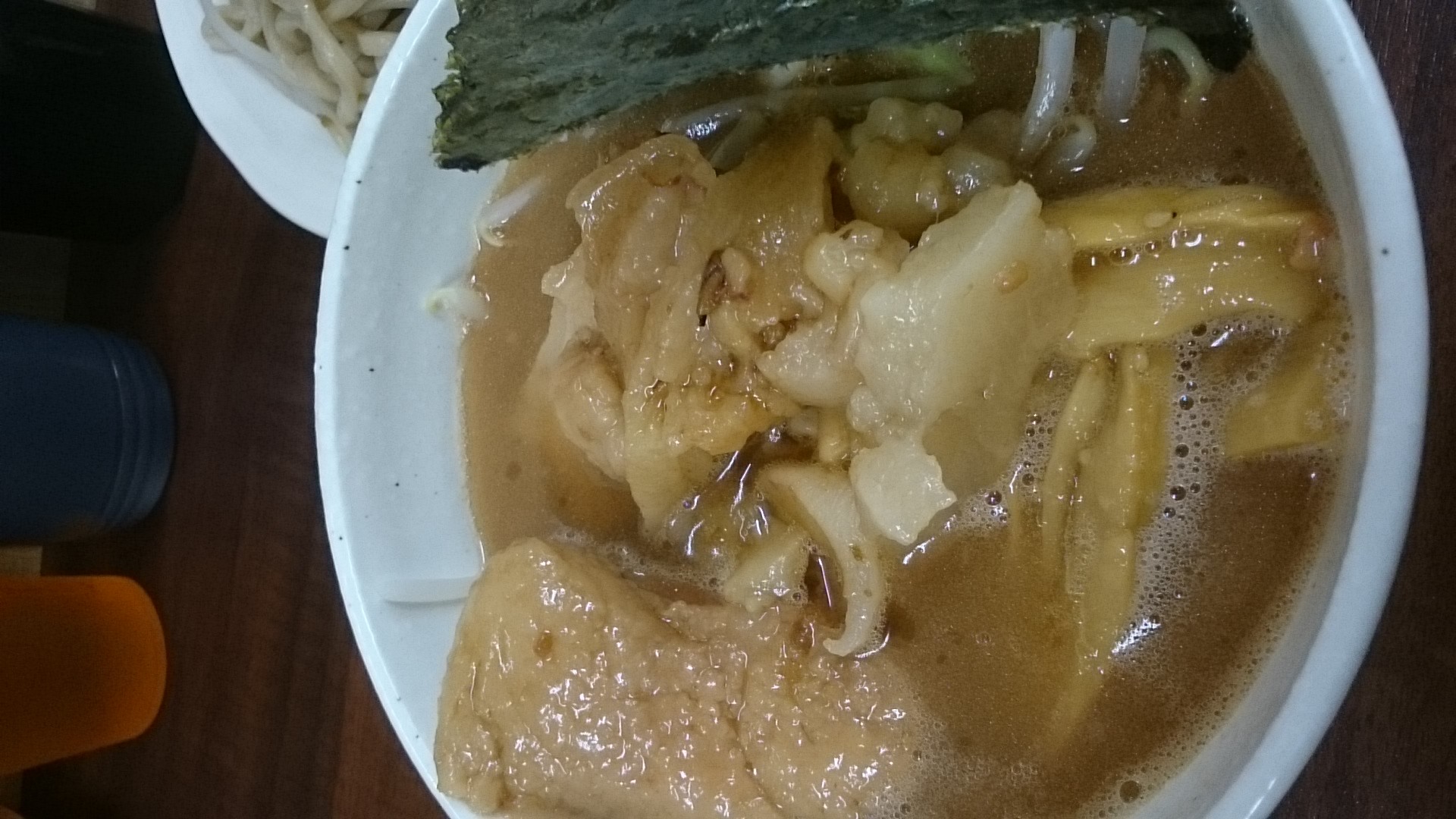 スープの器は具だくさん状態。しかし一番大きいのは脂ですかね。J系では珍しい海苔とメンマも、コチラの器に入っています。