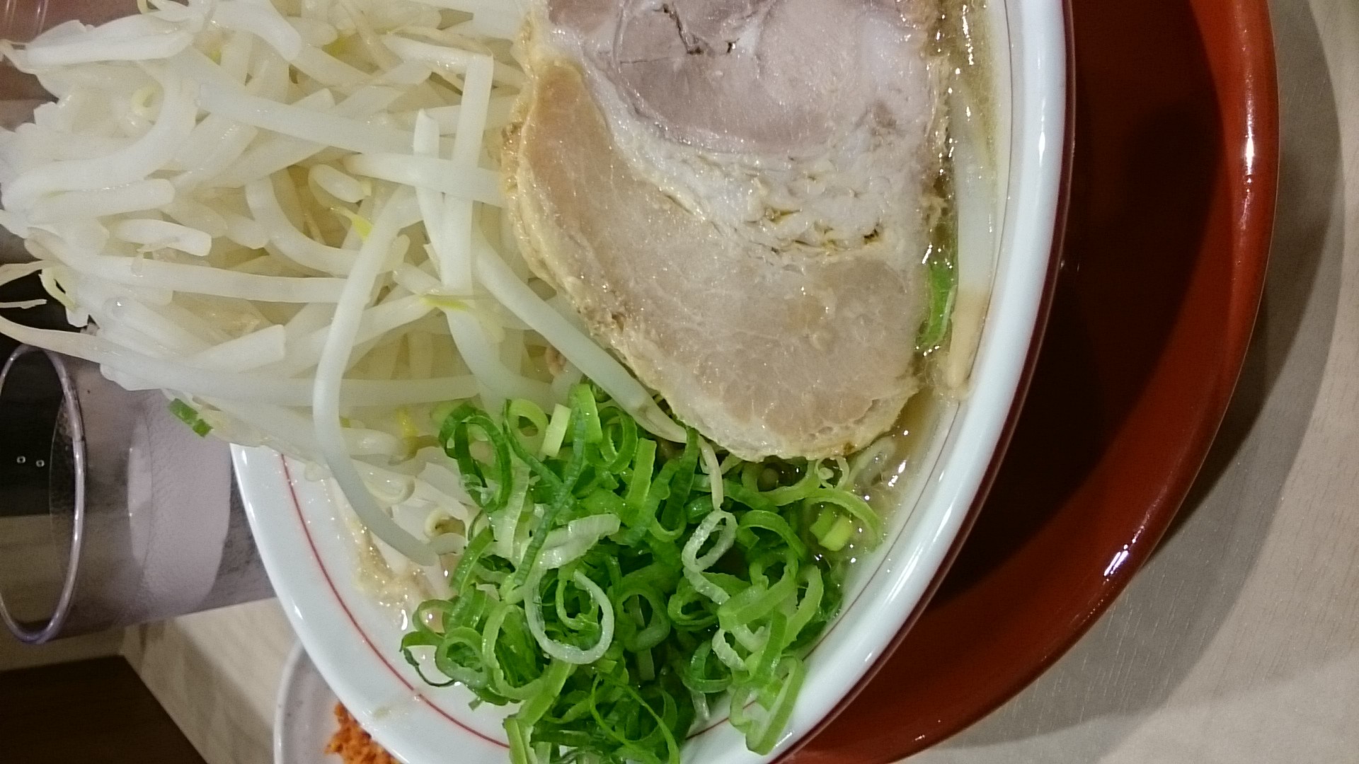 麺は中太〜太い平打ちのストレート麺。値段も値段なので100g以下かな、と思っていましたが、120g以上はありそうなイメージ。バランス的に麺が勝っているイメージはありますが、普通にうまいです。デフォで替玉2回まで無料なんですよね。麺が無くなるちと前に替玉をお願いしました。私が替玉をお願いすると、「他に替玉の方いらっしゃいませんかぁ」的に、他のお客さんに声掛けするシステム(?)。