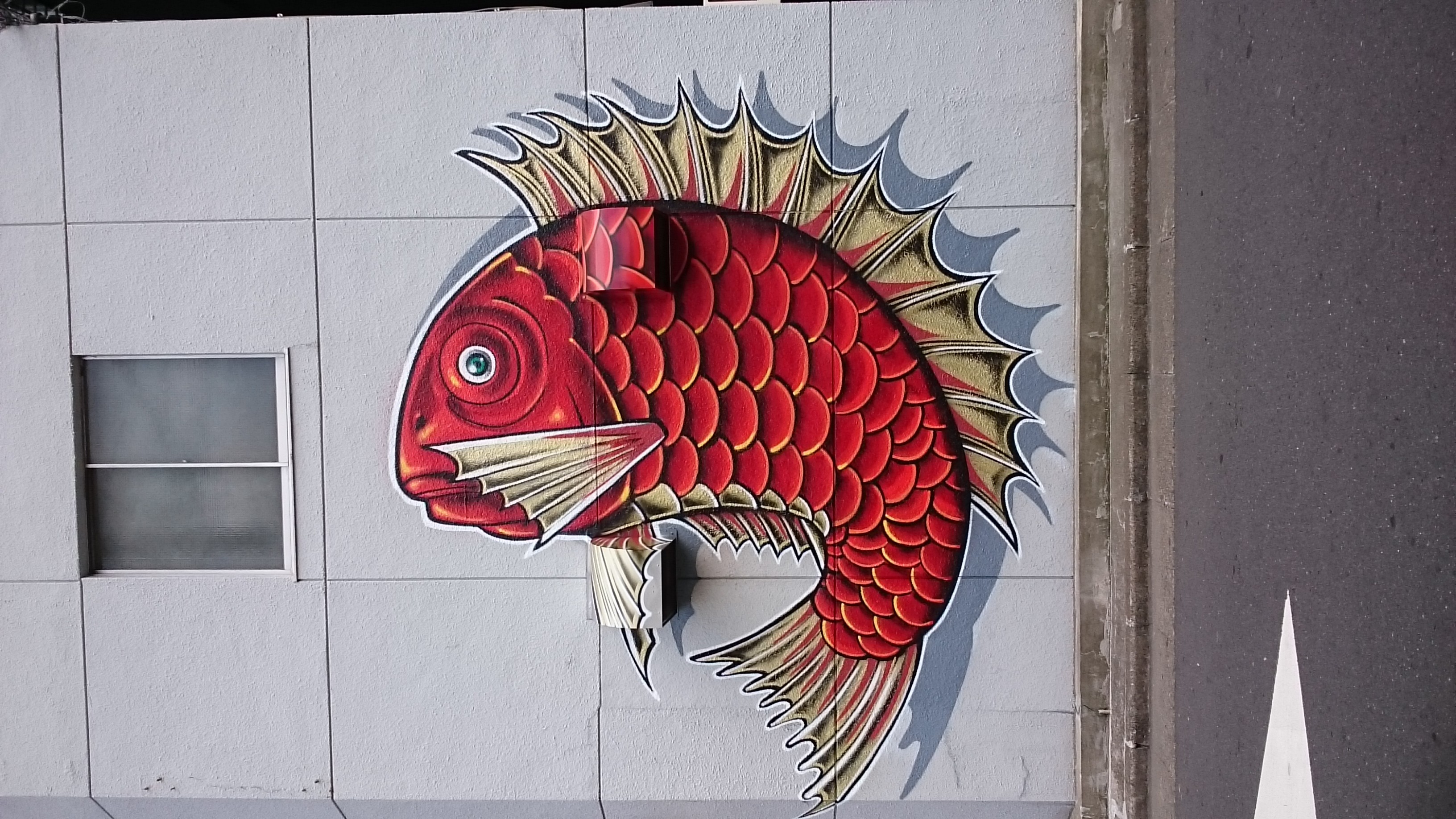 大き目なL字カウンター、角っこに大きな鯛のオブジェ。まぁ店頭の壁に描かれた鯛に比べれば全然小さいですけど、これだけでも存在感あるなぁ。