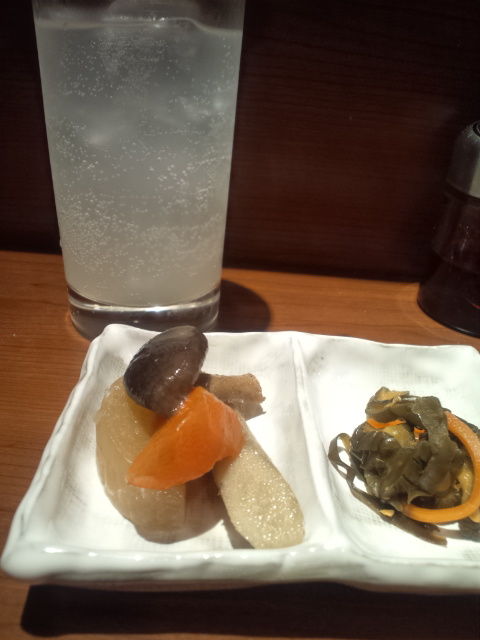 夜はアルコールも出しているようなのでグレープフルーツサワー(400円)でひとりお疲れちゃん♪つきだしを頂いたところで、ラーメン屋らしからぬメニューのじゃマグロほほステーキ(400円)。ほろほろでうま。スライスにんにくたっぷりで醤油系で焼いた感じ。