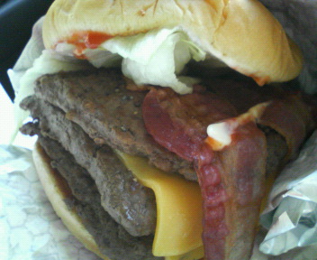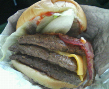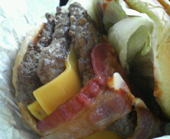 バンズ3枚にチーズにベーコン。絶対カロリーはチェックしてやるもんか。でもバンズ1枚のハンバーガーが期間限定のようだが100円だったような。それを5個買えば、あ・・・。