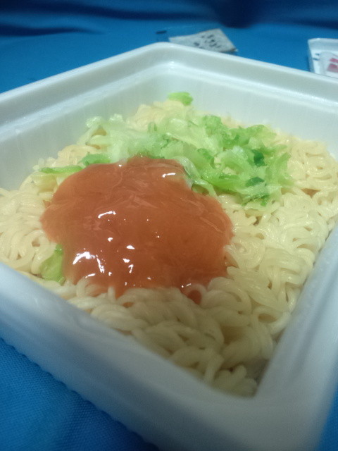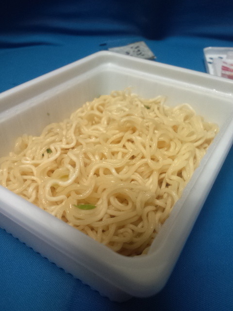 適度な時間の後に湯切り。湯切りシールを開けるとにんにくの香りが広がります(私の部屋に。布団に染み込まないでね・・・)。