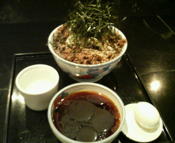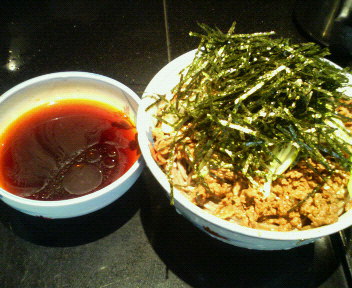 超立体的だが刻み海苔を混ぜると、早くも普通の大盛りな感じに。つけ汁はちと辛めの醤油つゆだが、あっさりながらも投入されたラー油が香りとコクと、少しのジャンクな感じで楽しめます。
