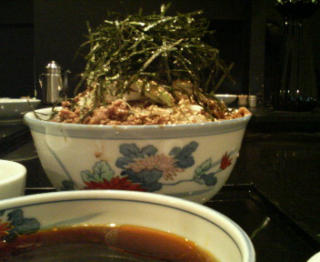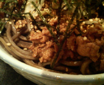 蕎麦が茹で上がり2つの層の水で〆、ザルで水切りをして器に盛り付けられます。蕎麦の上に甘く煮た肉、白ごま、刻みネギ、刻み海苔が立体的に盛られて完成。