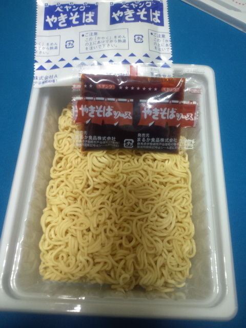 外の包装を剥がすと白いいつものペヤングに。空けてみると、これまたいつもの?乾燥野菜系袋とソースの袋。